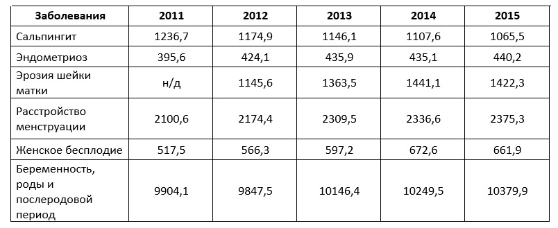 По данным исследований министерства здравоохранения Российской Федерации зарегистрированных больных страдающих гинекологической заболеваемостью женского населения в возрасте от 18 лет и старше представлены в таблице: