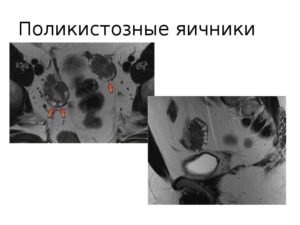 УЗИ органов малого таза. При ультразвуковом анализе, может быть выявлено двустороннее увеличение яичников от 2 до 6 раз (более чем 9 см3) с разрастанием стромы, примерно объем занимает 25% объема, с большим количеством подкапсульных фолликулов размер которых может достигать от 5 до 8 мм в виде «колье» на эхосрезе, но при этом есть недостаток доминантного фолликула. Матка несколько уменьшена в размерах.
