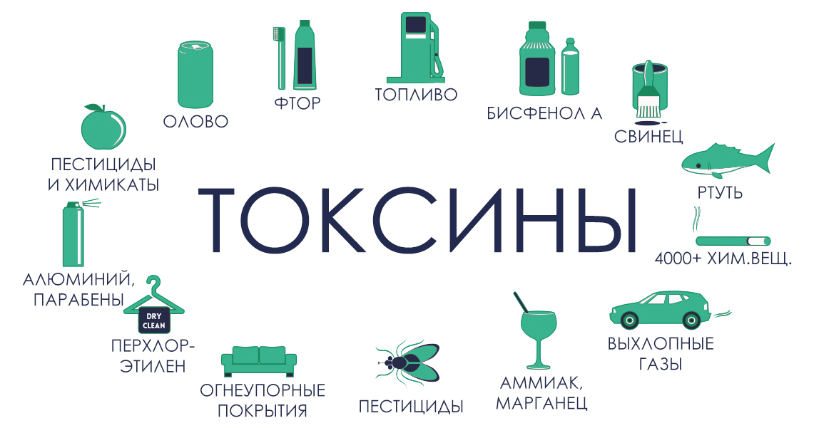 - Токсины от воздействия свободных радикалов (стрессы, гипер и гиподинамия, гликация белков, ожирение, гипоксия)