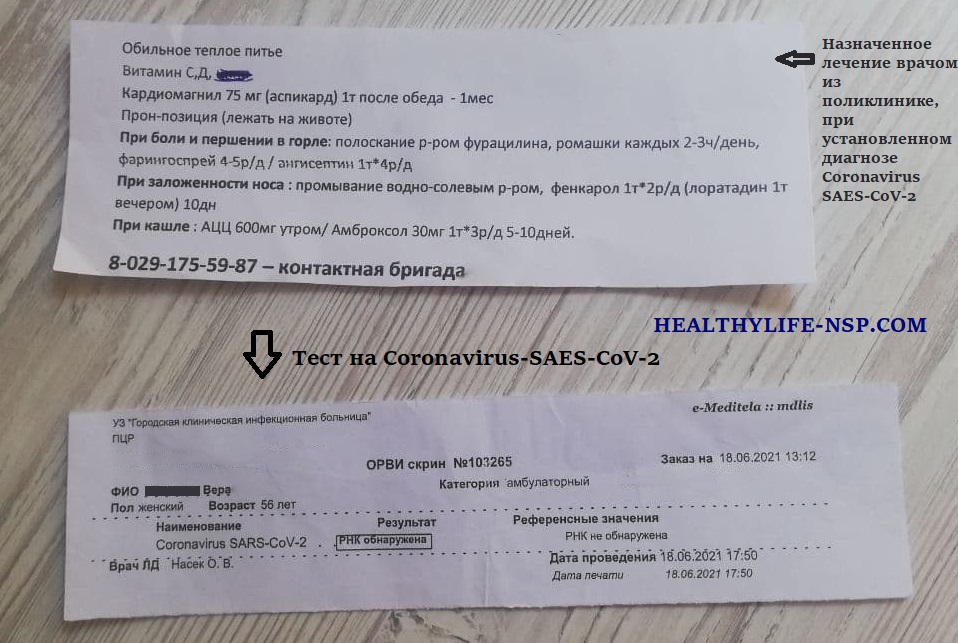 А уже 18.06.2021 позвонили из поликлиники и подтвердили наличие Covid (Коронавируса) у женщины 56 лет при этом запретили приходить в поликлинику и сообщили, что врач придет сам через 4 дня, но если станет хуже вызывать скорую помощь (анализ теста на Covid (Коронавирус) в карусели, фамилию она попросила не показывать). По телефону врач сказала, что антибиотики и противовирусные можно не пить, они не помогут, а из лечения назначали пропить витамин С, Д. Женщина обратилась ко мне за помощью, чтобы справиться с таким тяжелым состоянием. На одном из вебинаров по здоровью к. н. мед наук врач Антилевский В. В и Лысиков Ю. А. составили схему по лечению Covid (Коронавируса) которой в этом случаи мы и воспользовались.